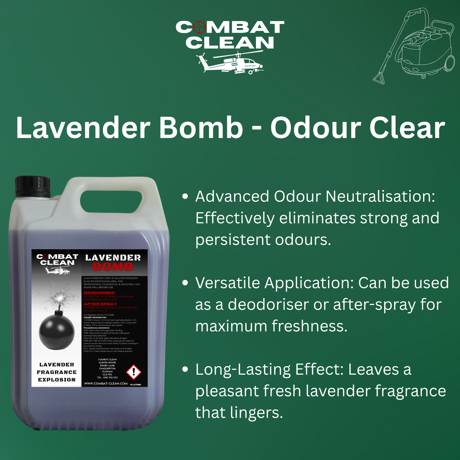 Lavender Bomb is a powerful odour neutraliser designed to eliminate unwanted smells and refresh any space. Its advanced formula works effectively as both a deodoriser and an after-spray, leaving behind a long-lasting fresh scent.